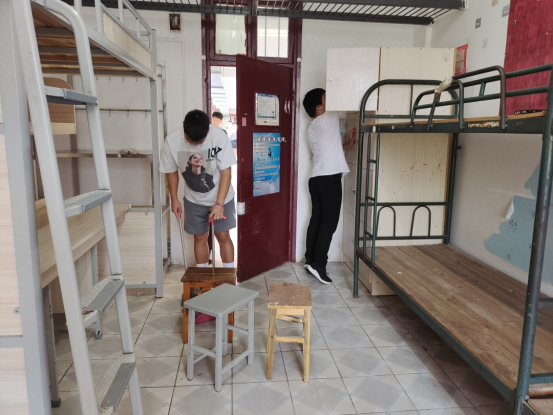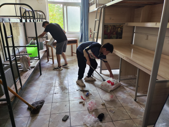 经过前期精心的安排,大家迅速投入到清扫工作中,大家分工明确,各司其职。所有人员都手持抹布或拖把投入到寝室卫生打扫当中,对宿舍门、桌面、床板等每一个角落每一处污垢都认真的清理打扫。经过两个小时的努力,充分发扬不怕脏、不怕苦、不怕累的精神,让新生宿舍环境焕然一新。