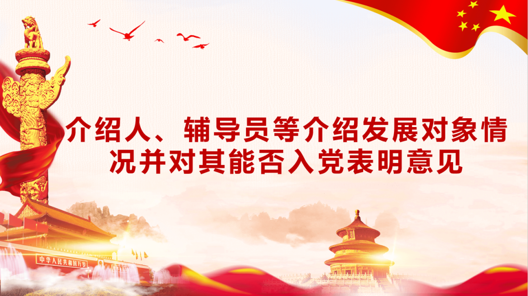 介绍人、辅导员等介绍发展对象情况并对其能否入党表明意见。