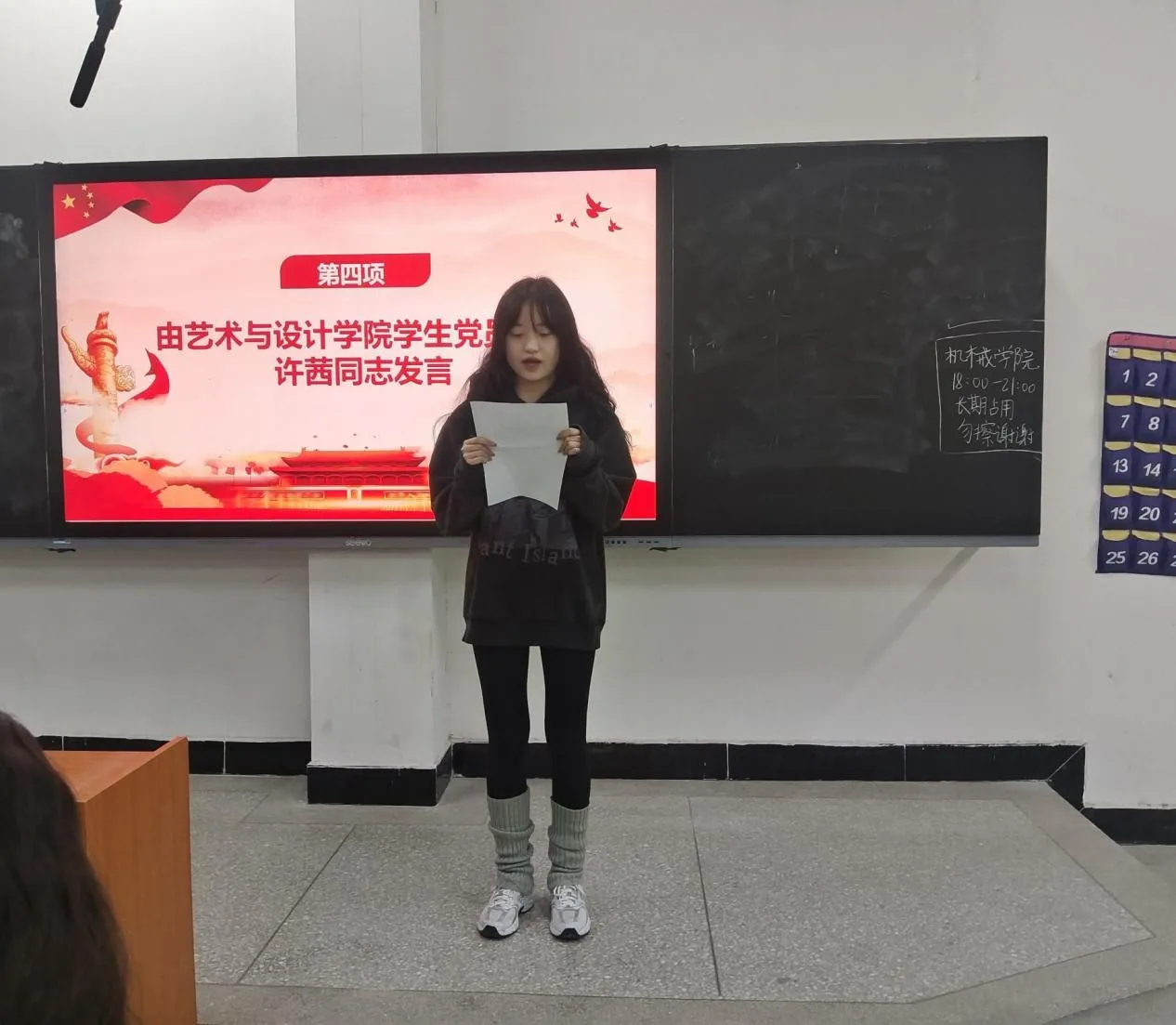 艺术与设计学院学生党员代表许茜上台发言,她希望各学员作为学院中力量要承担起相应的职责,对自己严格要求,在学习和工作上发挥模范带头作用,坚定理想信念,珍惜并抓住此次学习机会,努力提高思想政治水平,自觉遵守党校的一切规章制度,以实际行动向党组织靠拢,争取早日成为一名合格的共产党员。