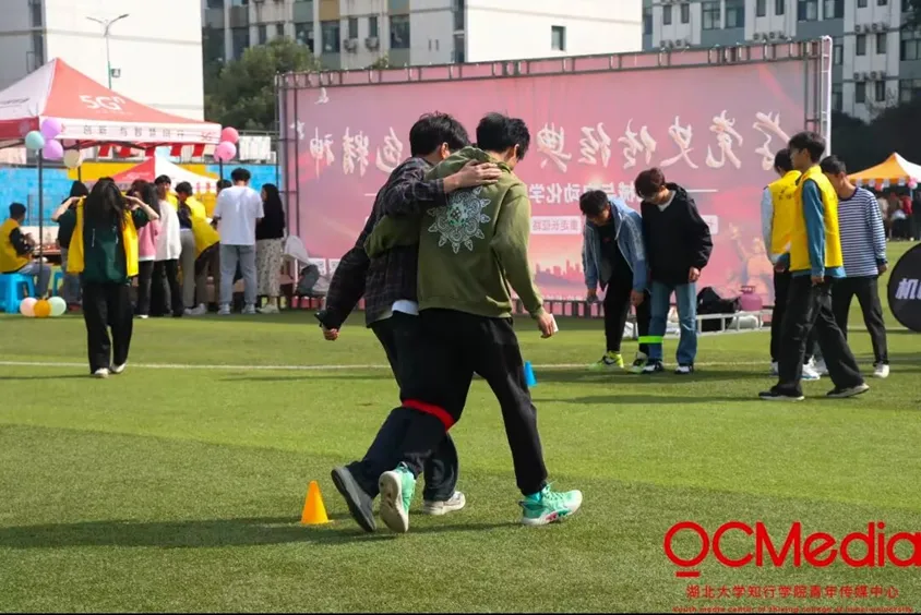 活动内容:两人组队,将其中一人的左腿与另一人右腿用绳子绑在一起,两队同时从起点出发,跑到对面标志桶后开始答题,答对即可直接返回,打错则需要向前跑到下一标志桶才可返回。全程需往返2次,最后率先回到起点的队伍胜。