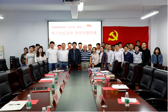 2018年10月10日下午2点pp电子官方网站党总支于知远楼601会议室召开了主题为“学习党纪条例,铸牢师德师魂”的党日活动。学校纪检委员焦新曦书记、pp电子官方网站院长王代萍,pp电子官方网站副院长(兼副书记)陈驰,院学生党支部指导老师石晶晶,辅导员王松、李伟健,纪检委员(兼教秘)甘雨、教师陈艳、张斯阳、陈烨欣、马志德、宋涛、实验室教师吴鹏、何将及pp电子官方网站在校学生党员参加了本次会议。会议由甘雨同志主持。