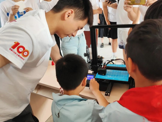 活动中团队成员为胡市中心小学的同学们普及3D打印技术的知识,并和小组员一起进行3D打印机的演示操作,志愿队的老师和大学生们悉心指导,鼓励小同学们亲身参与体验3D技术。